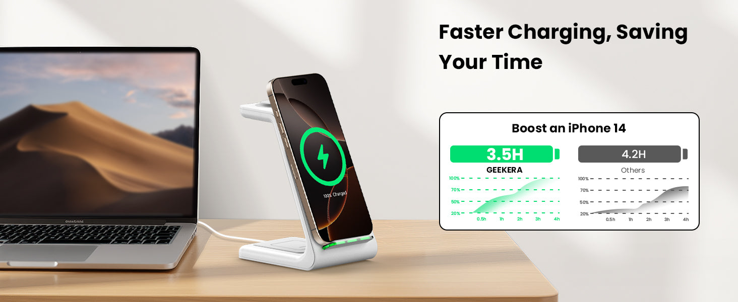 - Complete Safety, Reliable Service: Always safeguard your safety! GEEKERA 3 in 1 wireless charger boasts advanced temperature control, over-current protection, over-voltage protection, foreign object detection and more. Moreover, enjoy worry-free charging with our GEEKERA wireless charging station for Apple, which comes with 1*QC 3.0 18W Adapter, 1*3.3ft/1m 3A USB-A to USB-C Cable and a 24-Month Warranty!