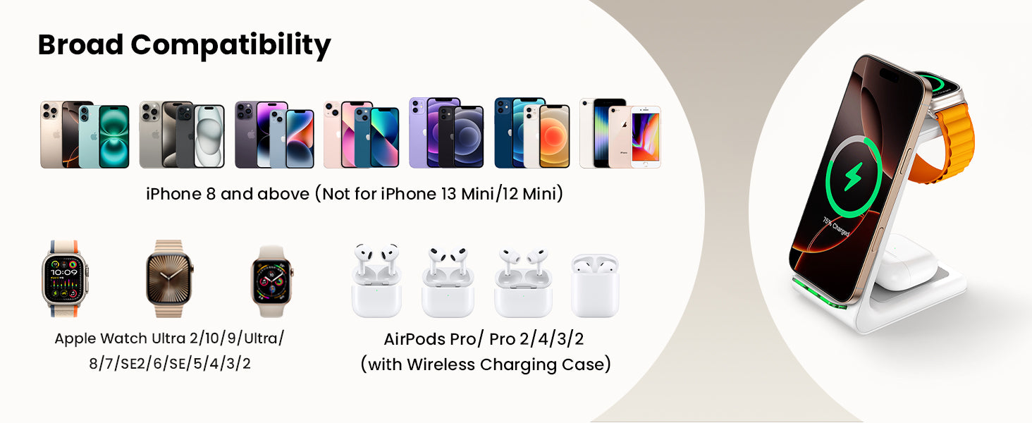 - Home for All Your Devices: Your ultimate charger is here! The wireless charging station can charge iPhone 16/15/14/13/12/11 series and much more, Apple Watch Ultra/10/9/8/7/6/5/4/3/2/SE, and AirPods Pro 2/Pro/4/3/2 (wireless version). The wireless charging station is versatile and designed to make your life easier! (NOT for iPhone 13 mini/12 mini/AirPods 1)
