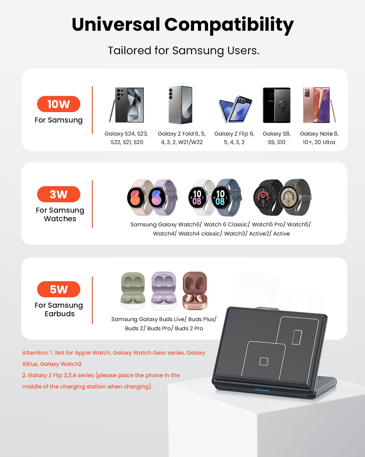 - 3 in 1 Multi Charger Station: Tired of juggling multiple chargers for your gadgets? Look no further! GEEKERA 3 in 1 wireless charger for Samsung is a one-stop solution for all your devices. It is specially designed for Samsung Galaxy Z Fold & Flip Series, and works flawlessly with Samsung Galaxy S24 S23 S22 S21 S20 and Note Series, for Galaxy Watch 7 6 5 4 3 and Active 2/Active, for Galaxy Buds Live/Buds Plus/Buds 2/Buds Pro/Buds 2 Pro, eliminating the hassle of multiple chargers. The wireless charging station is versatile and designed to make your life easier!