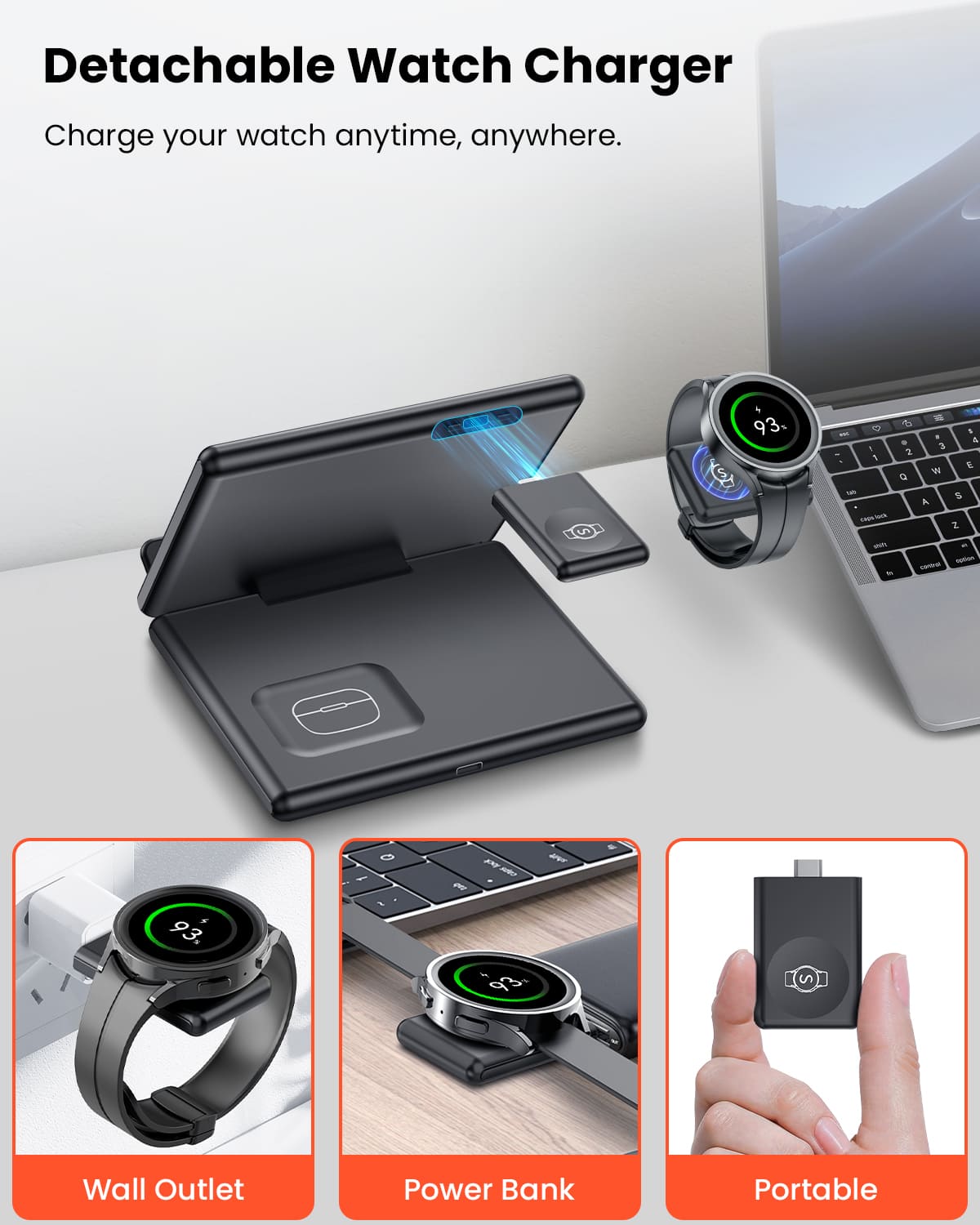 - Detachable Watch Charger: The watch part is designed to be removable, so you can unplug it from the wireless charging station and plug it into your laptops, wall chargers, and power banks for quick charging. When you fold the wireless charging station, you could store this watch charger on the back of the station, which is so convenient and space saving.